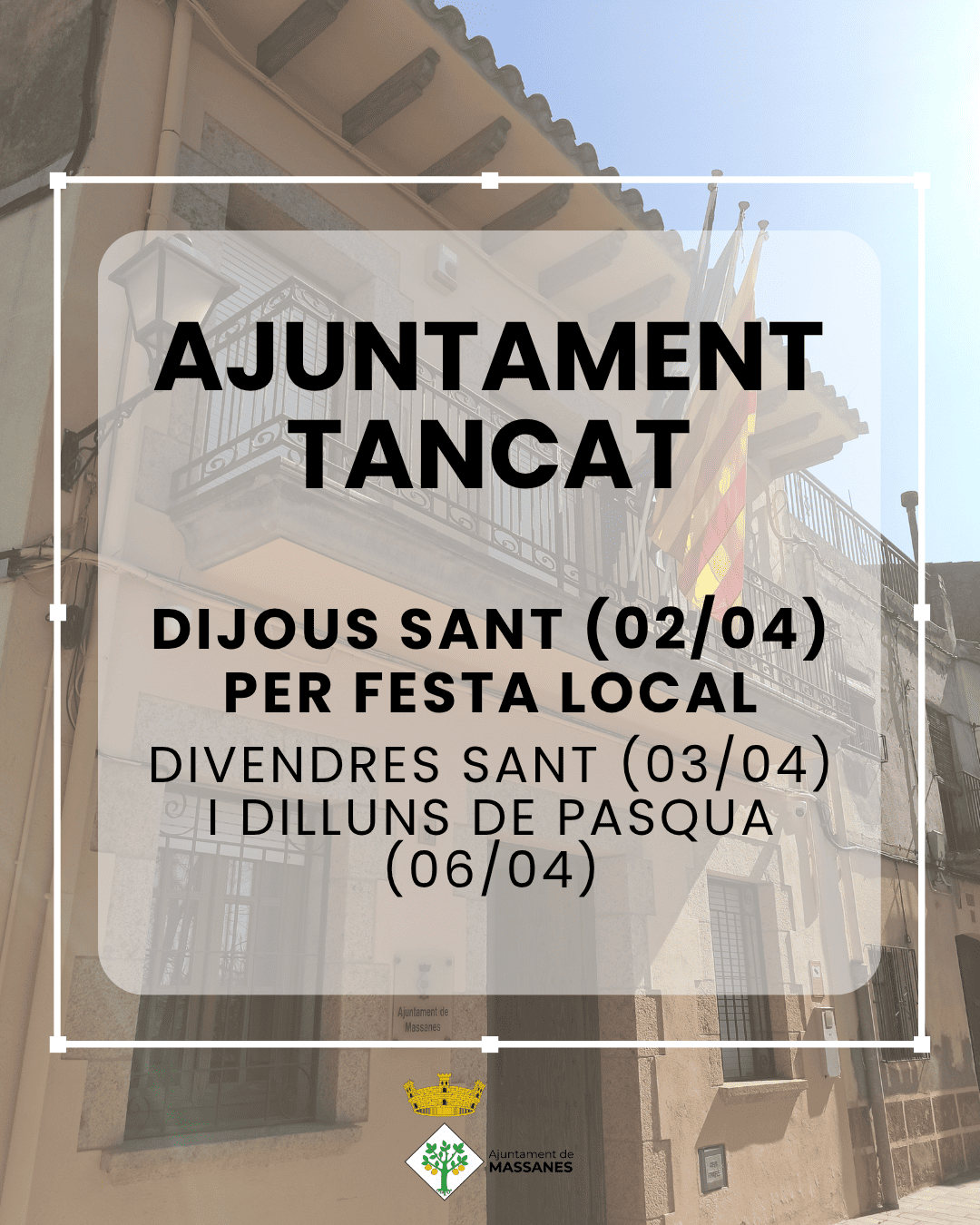 Us recordem que les oficines de l’Ajuntament de Massanes romandran tancades els dies 2 d’abril (dijous Sant), 3 d’abril (divendres Sant) i 6 d’abril (dilluns de Pasqua).