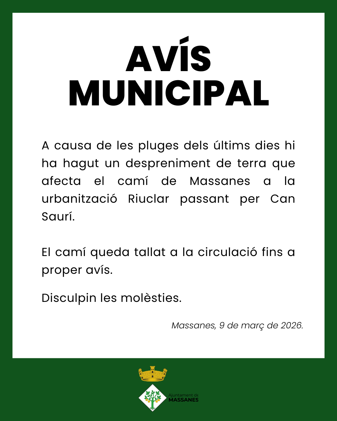 General, Notícies municipals Avís municipal: Camí tallat 09/03/2026 El camí de Massanes a la urbanització Riuclar passant per Can Saurí queda tallat a la circulació a conseqüència d’un despreniment de terra. < Entrada Anterior