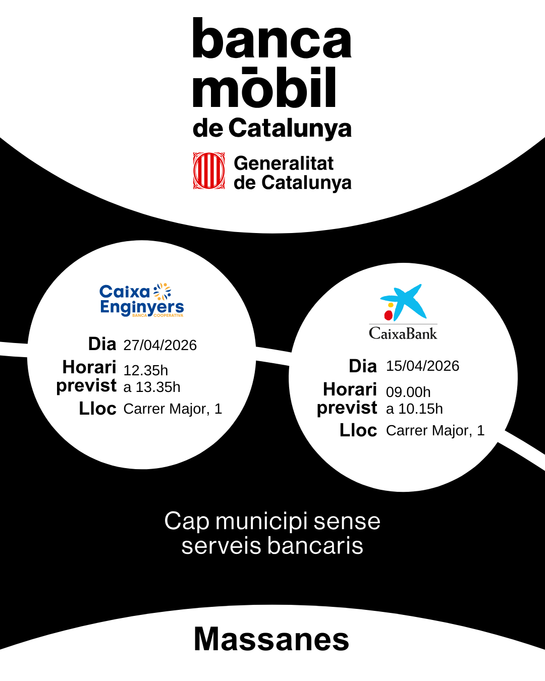 General, Notícies municipals Banca mòbil: abril 10/04/2026 📢 Quins dies vindrà la Banca Mòbil a Massanes? 🔵 CaixaBank: 15 d’abril de 9h a 10.15h.🟡 Caixa Enginyers: 27 d’abril de 12.35h a 13.35h. Com sempre els podreu trobar al Carrer Major, 1. < Entrada AnteriorEntrada Posterior >