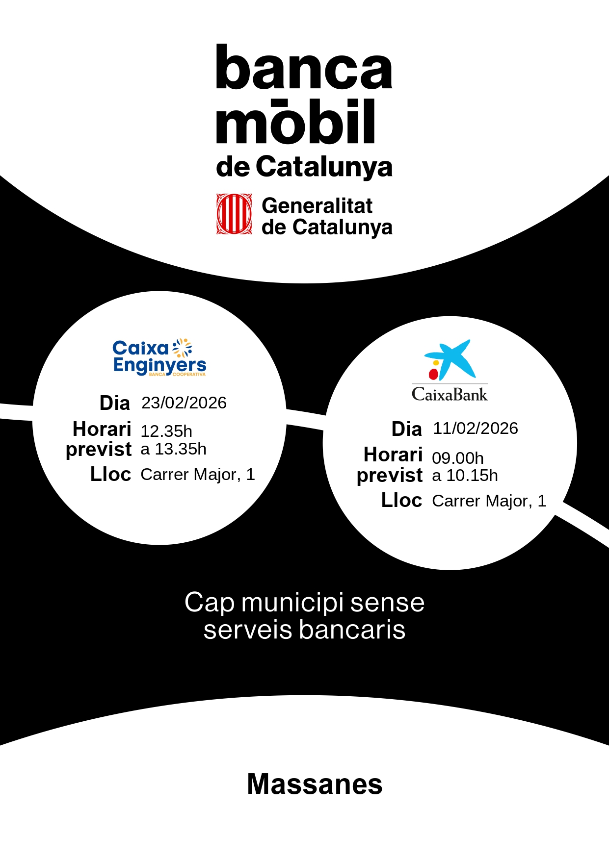 General, Notícies municipals Banca mòbil: febrer 27/01/2026 Quins dies vindrà la Banca Mòbil a Massanes? CaixaBank: 11 de febrer de 9h a 10.15h. Caixa Enginyers: 23 de febrer de 12.35h a 13.35h. Com sempre els podreu trobar al Carrer Major, 1. < Entrada AnteriorEntrada Posterior >