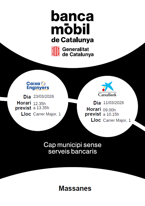 General, Notícies municipals Banca mòbil: març 24/02/2026 Quins dies vindrà la Banca Mòbil a Massanes? CaixaBank: 11 de març de 9h a 10.15h. Caixa Enginyers: 23 de març de 12.35h a 13.35h. Com sempre els podreu trobar al Carrer Major, 1. < Entrada Anterior