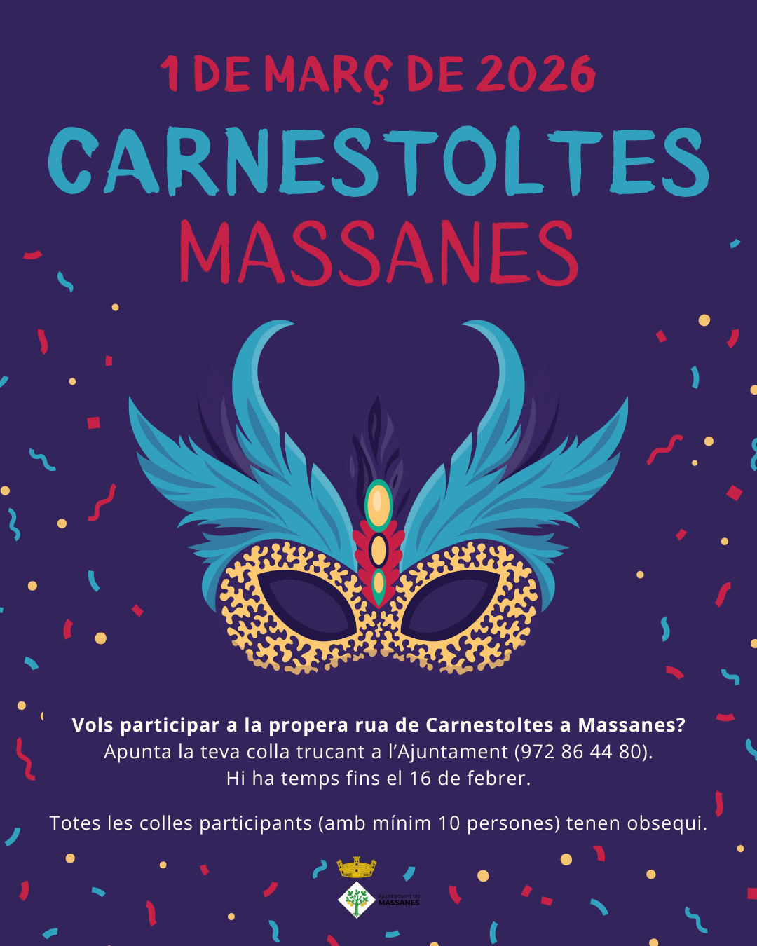 Si la teva colla vol participar a la rua de Carnestoltes de Massanes cal trucar a l’Ajuntament (972864480) per inscriure-la. Hi ha temps fins el 16 de febrer.