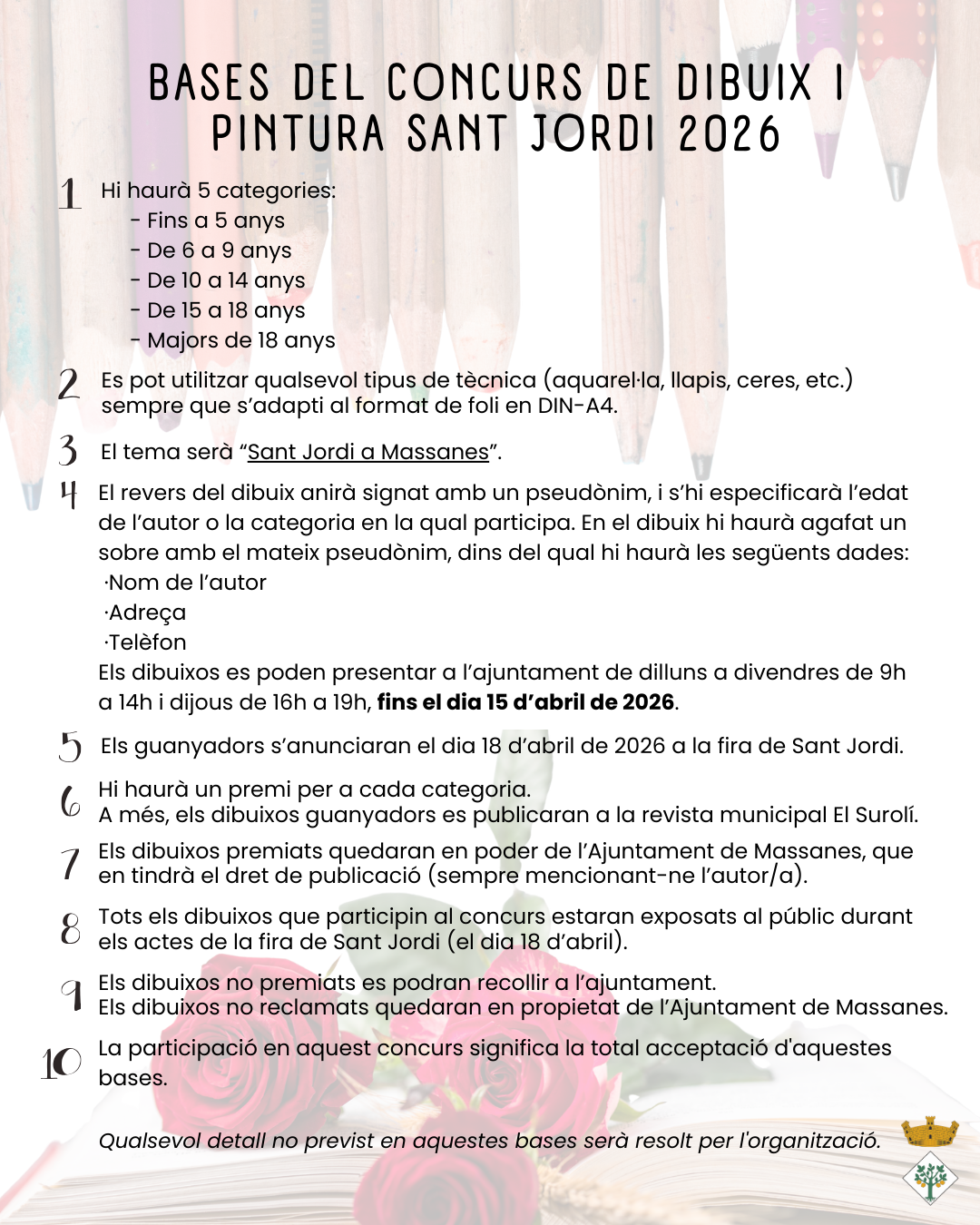 General, Notícies municipals CONCURS DE DIBUIX I PINTURA SANT JORDI 2026 17/03/2026 - 15/04/2026 Vols participar al Concurs de dibuix i pintura de Sant Jordi? Consulta aquí les bases del concurs i participa! Tens temps fins el 15 d’abril per presentar el teu dibuix a l’ajuntament. 🎨 < Entrada Anterior