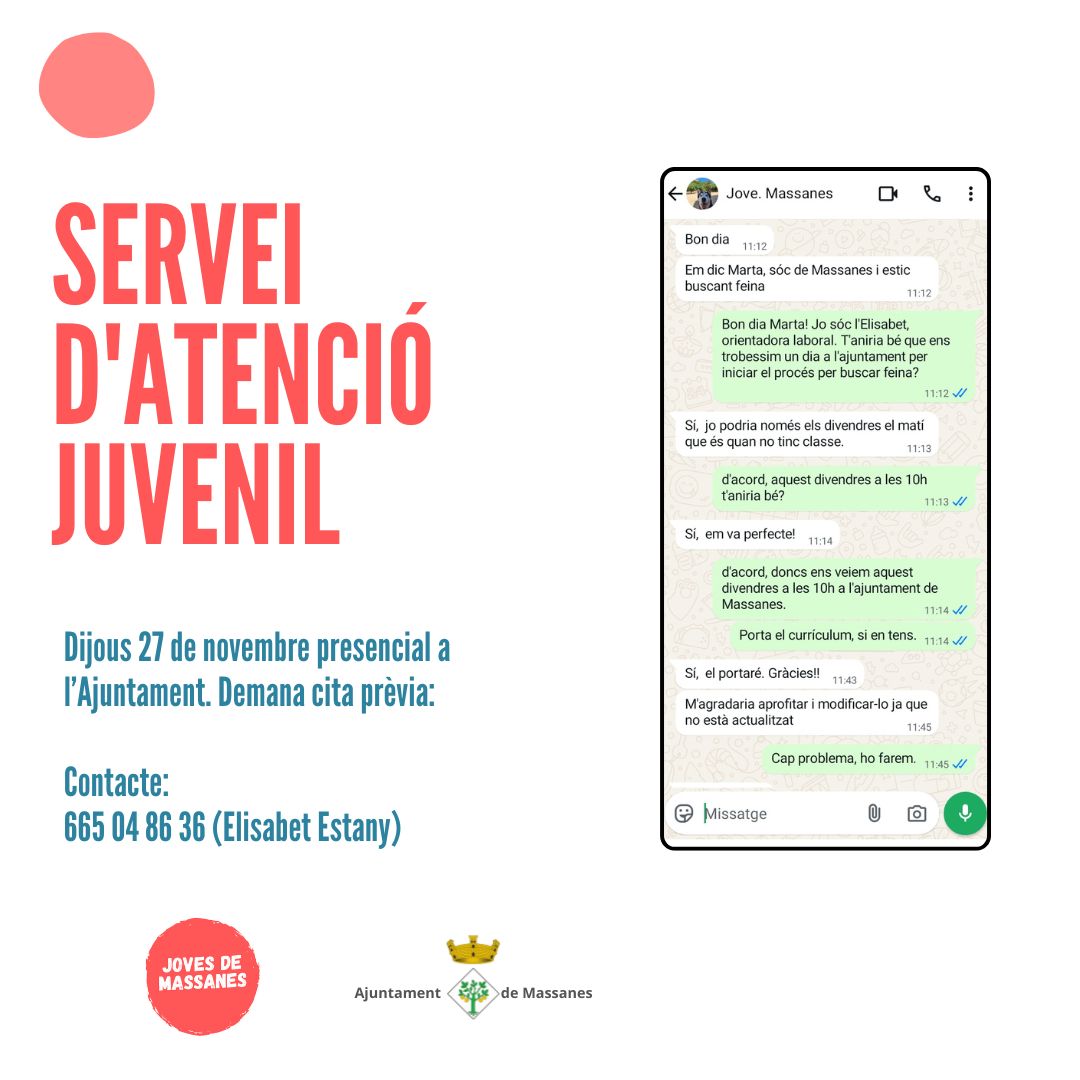 Dijous 27 de novembre durant el matí la tècnica de joventut de l’Oficina Jove de la Selva vindrà a l’Ajuntament de Massanes per fer atencions individuals a joves de 16 a 29 anys.